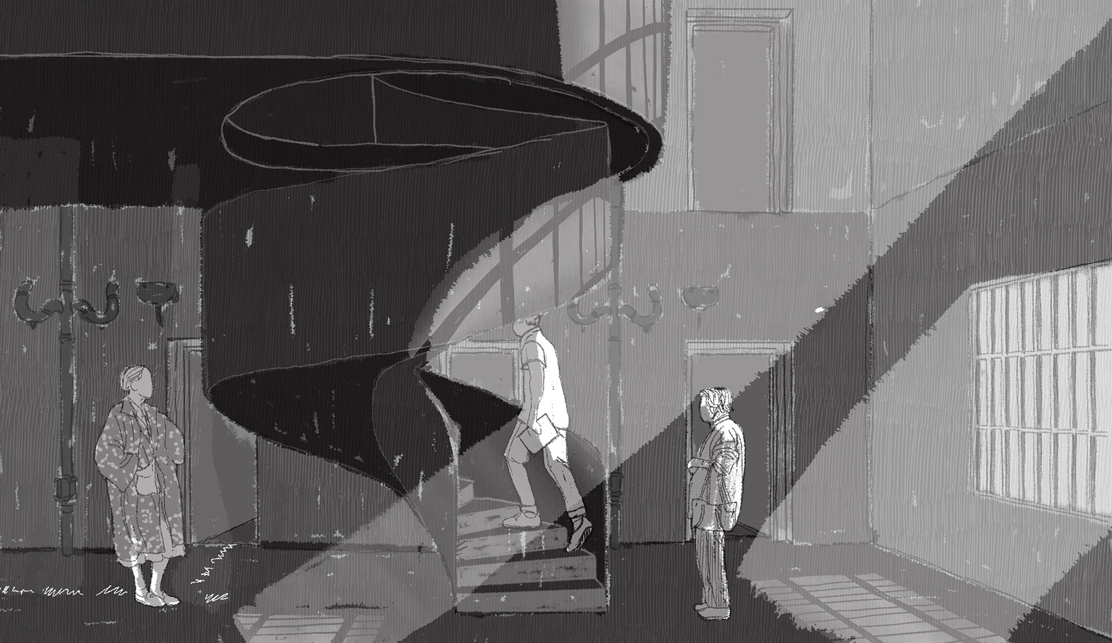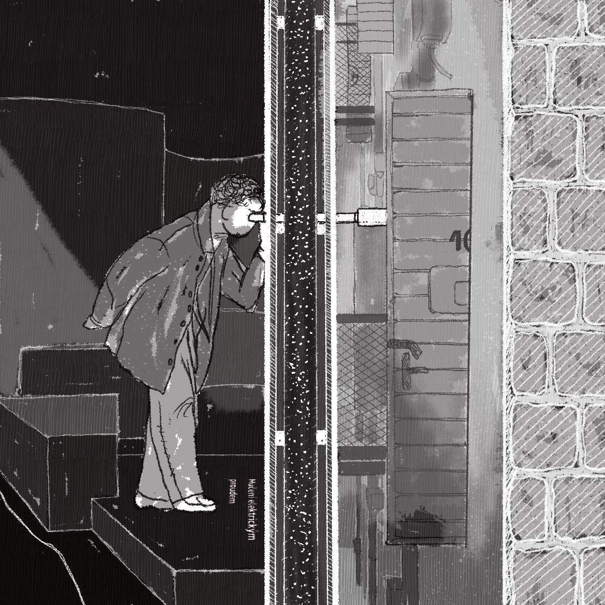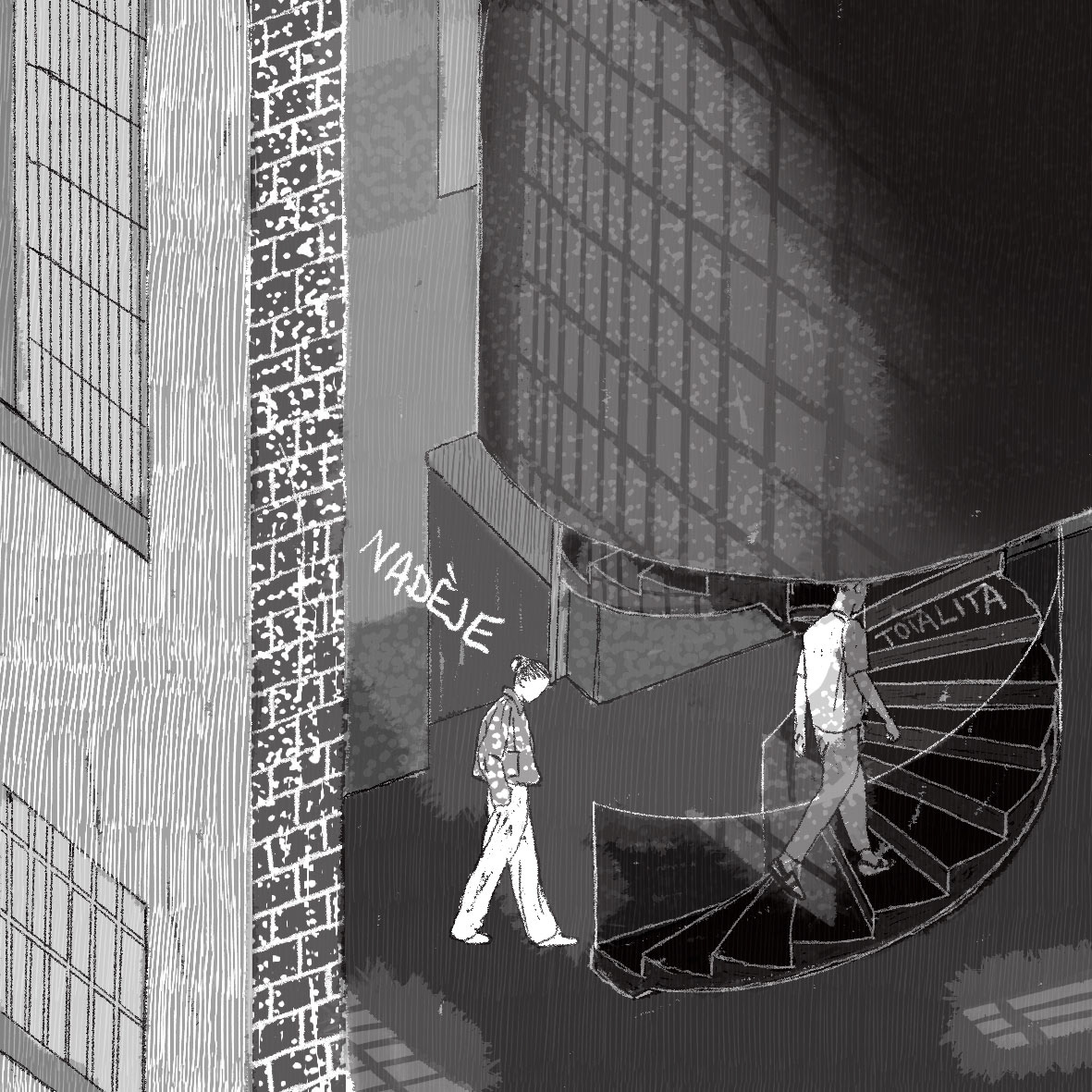 Cesta pokračuje po točitém schodišti, které návštěvníka vede zády ke světlu a naději. Stoupáním se ocitá v kruhu nejistoty, z jedné totality vstupuje do další.