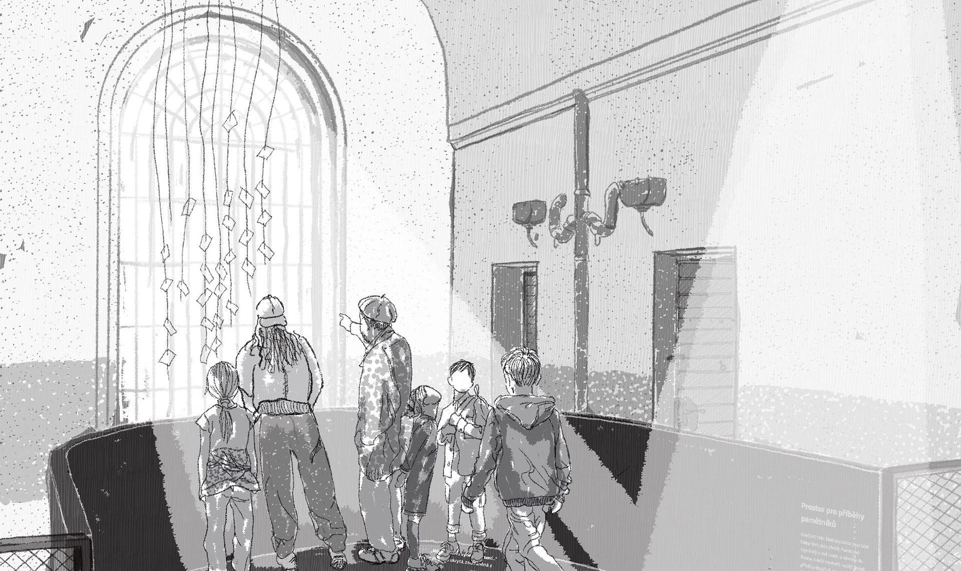 Na konci zážitku v prvním podlaží se návštěvník ocitá v prosvětleném převýšeném prostoru věznice. První záblesk naděje.
