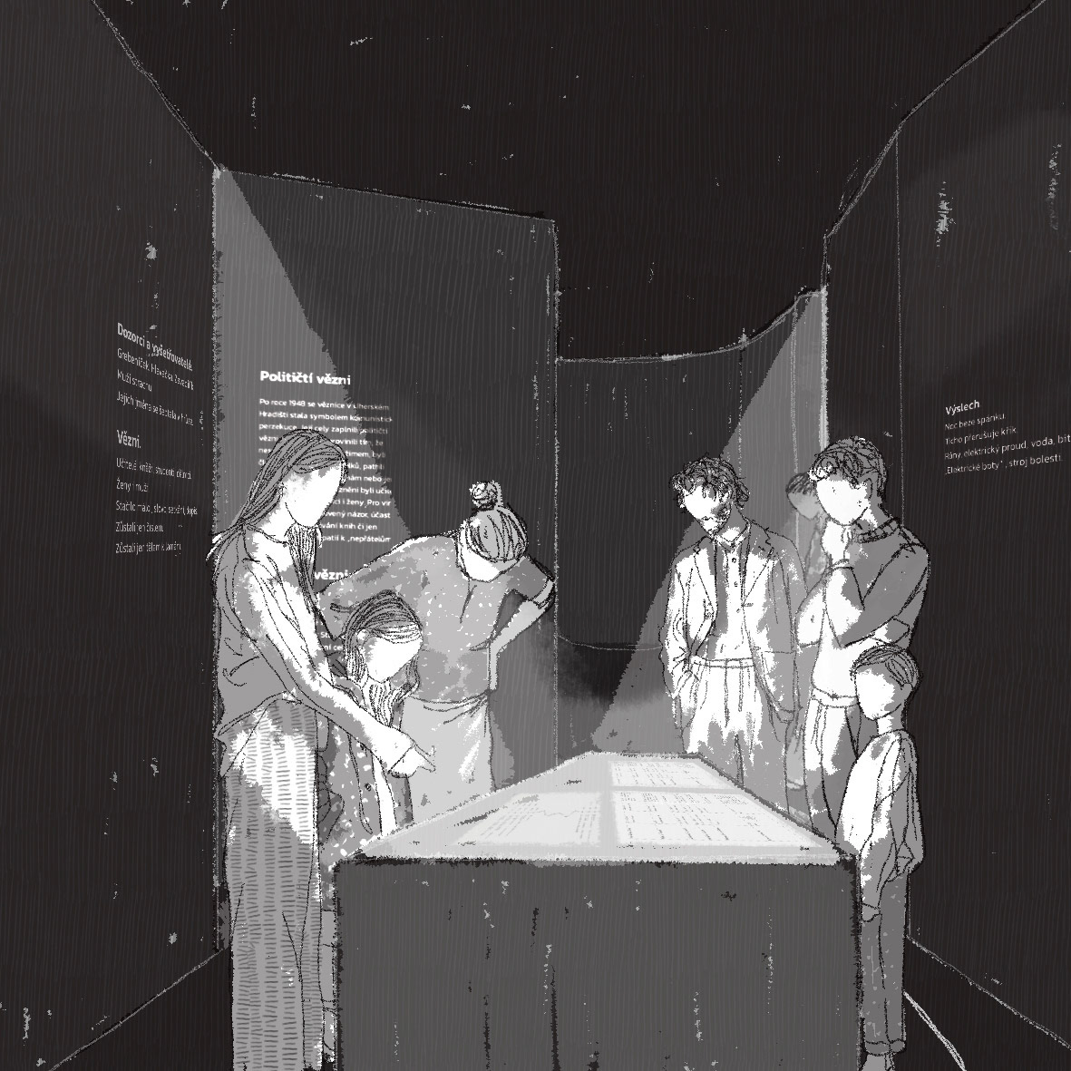Z boxu pak lávky směřují do jednotlivých cel, kde návštěvník poznává konkrétní lidské osudy. Místa, kde kdysi stáli bachaři, dnes vyplňuje ticho a prázdno – symbol ztracené svobody a neustálé kontroly.
