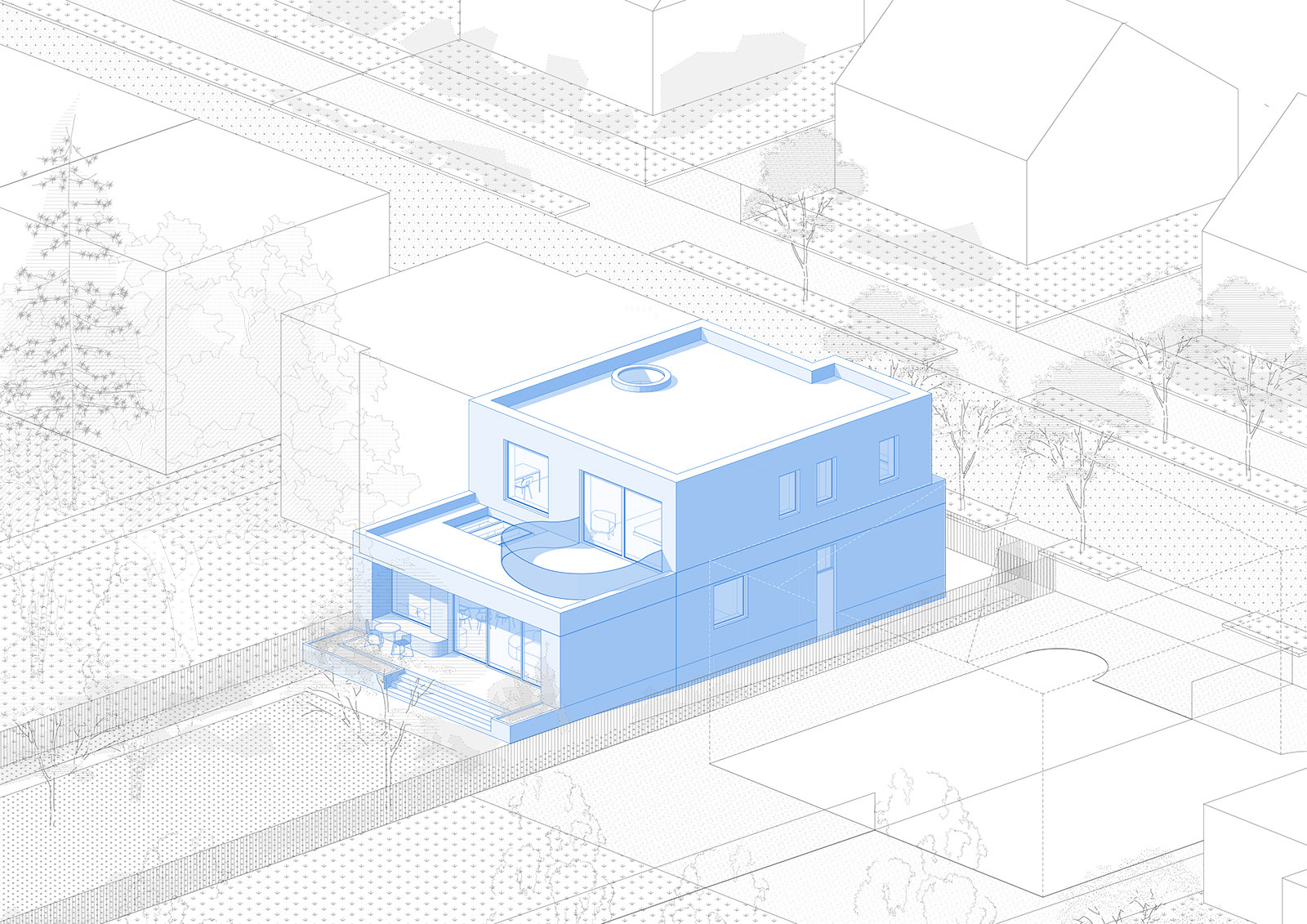 Základním motivem domu je průhled vedený od vstupu až do zahrady. Tato jasná prostorová osa spojuje vstupní podlaží v jeden celek, zjednodušuje orientaci a přirozeně propojuje dům s exteriérem. Přes omezené rozměry parcely působí interiér otevřeně a vzdušně.