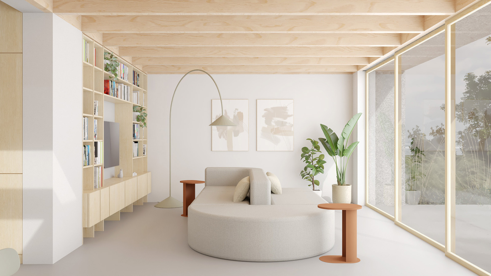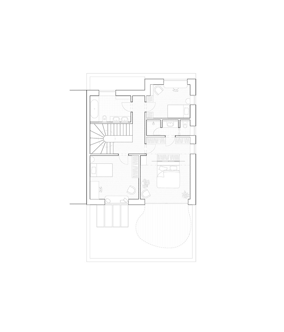 Ve druhém nadzemním podlaží se dům zklidňuje. Ložnice rodičů je orientována do zahrady, s cíleným výhledem z postele přímo do zeleně. Minimalistické řešení prostoru podporuje pocit klidu, soukromí a odstupu od ruchu každodenního života.