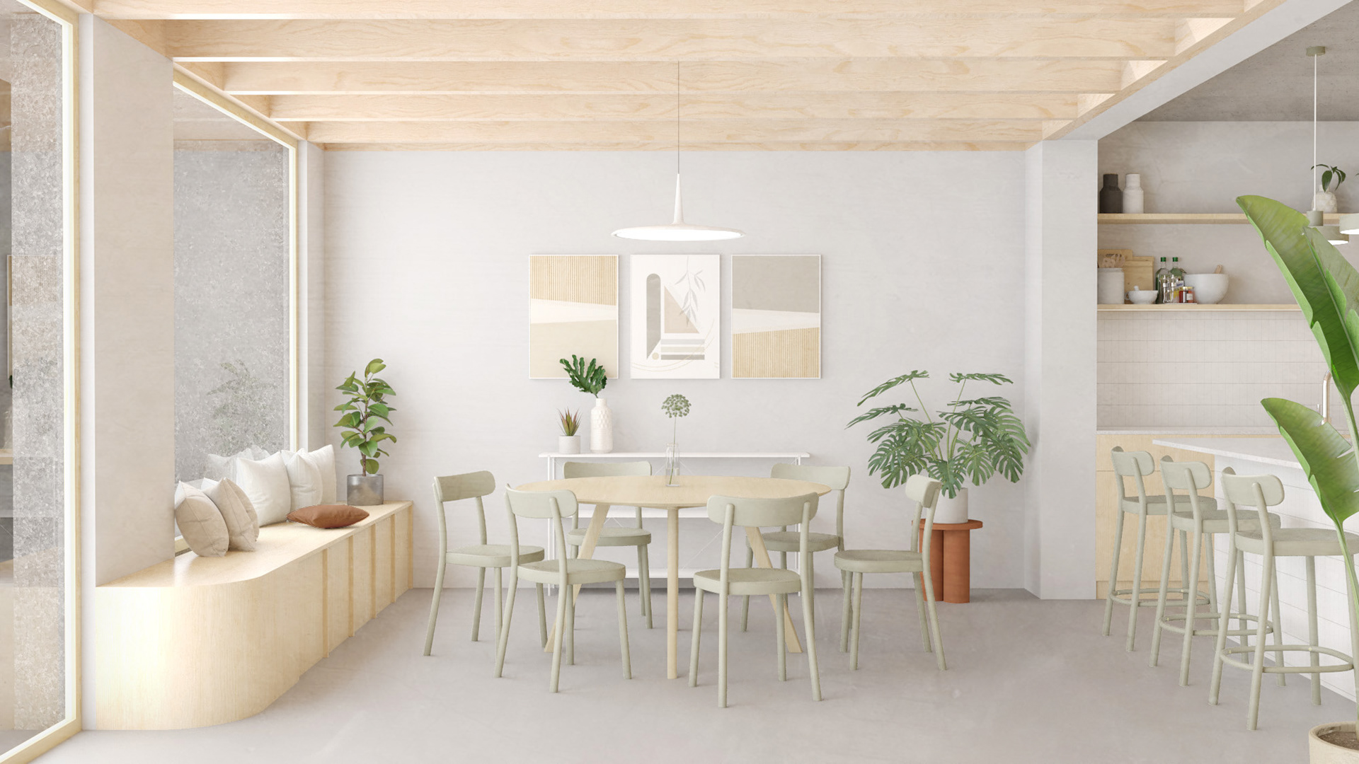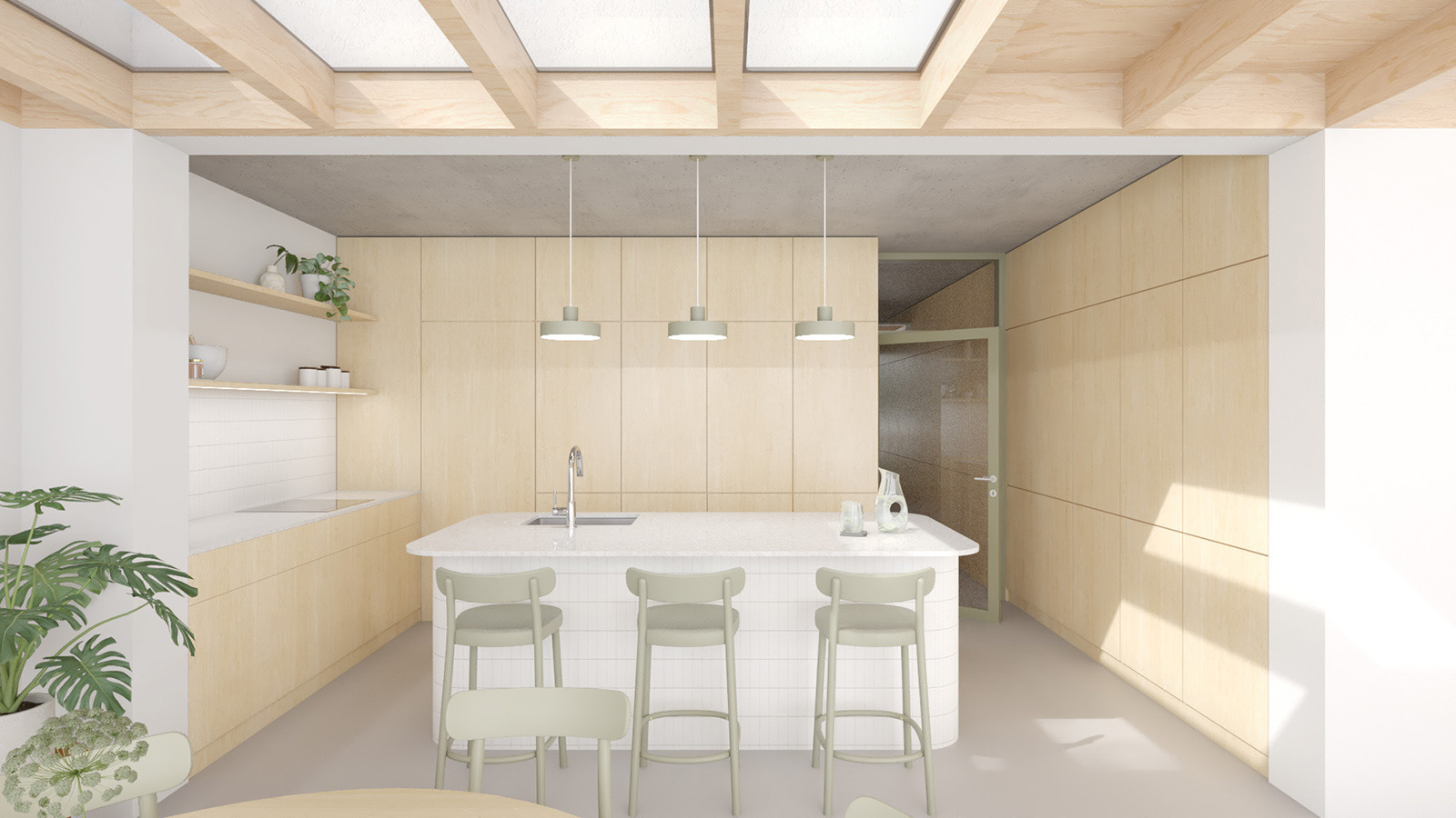 Přízemí dominuje otevřený obytný prostor. Kuchyně a obývací pokoj jsou orientovány směrem do zahrady a díky velkorysému prosklení se zahrada stává nedílnou součástí bydlení. Dispozice je jednoduchá, racionální a přehledná, bez nadbytečných chodeb. Speciálním přáním klientů bylo okno s lavicí, odkud mohou nerušeně užívat výhledu do soukromé zahrady.