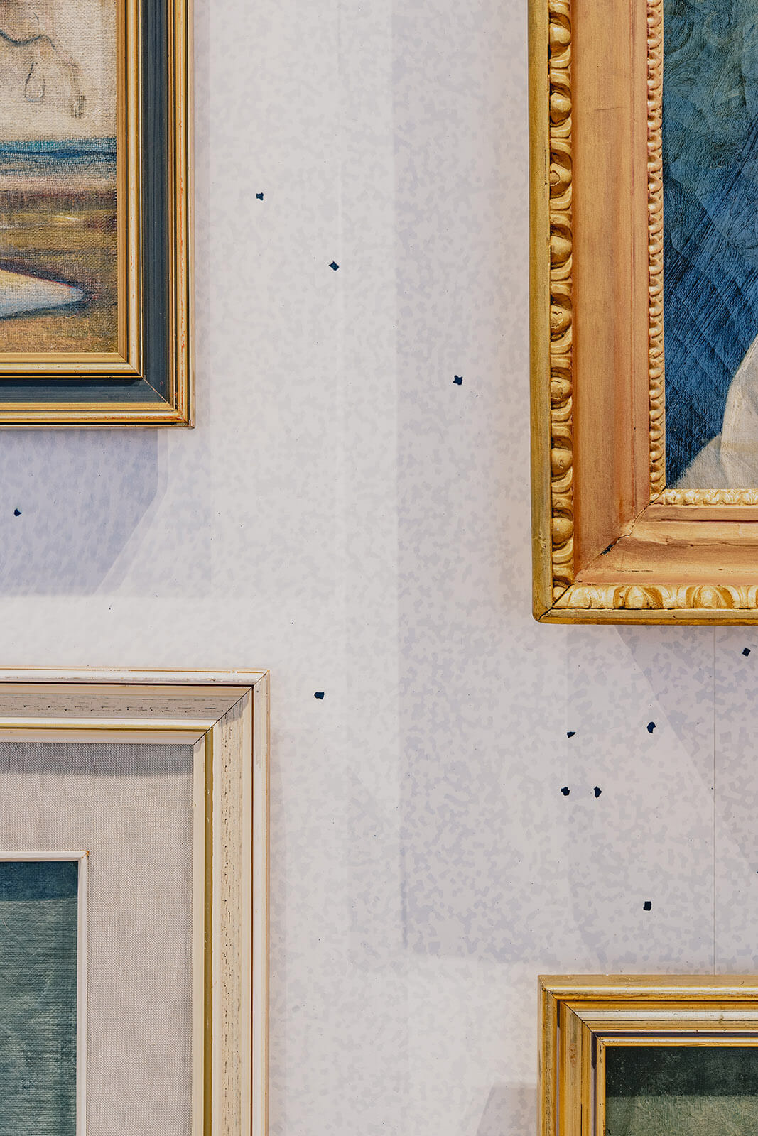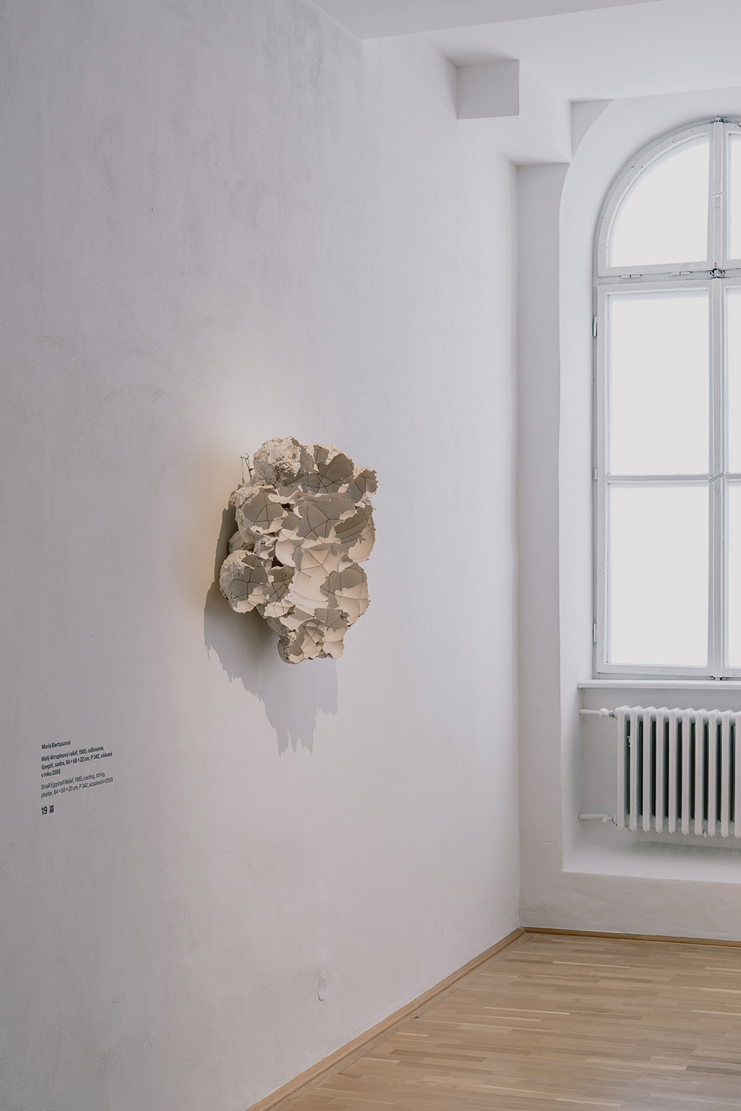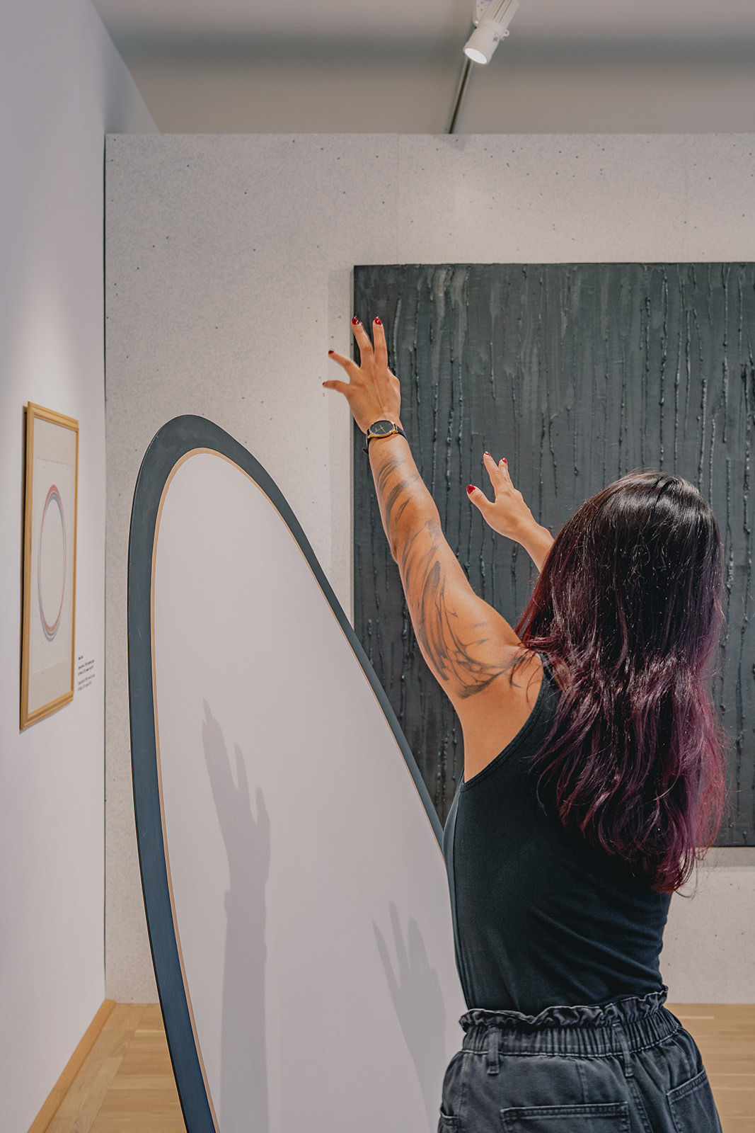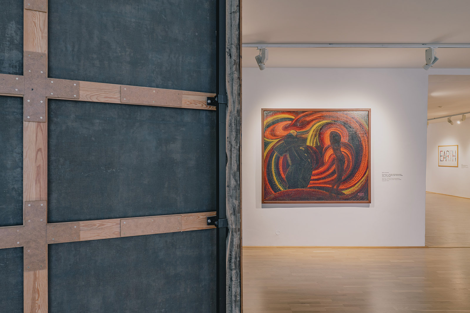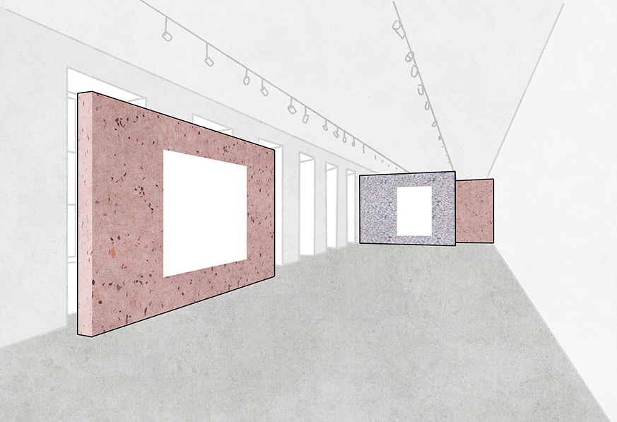 Prostor poté přizpůsobujeme potřebám galerie. Tvoříme čistý bílý prostor a vložené hmoty dělící nepřiměřeně dlouhou výstavní místnost. Modulární stěny z recyklovaných desek slouží také k zastínění oken pro potřeby vnímání děl.