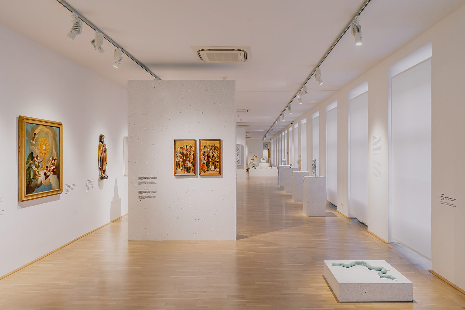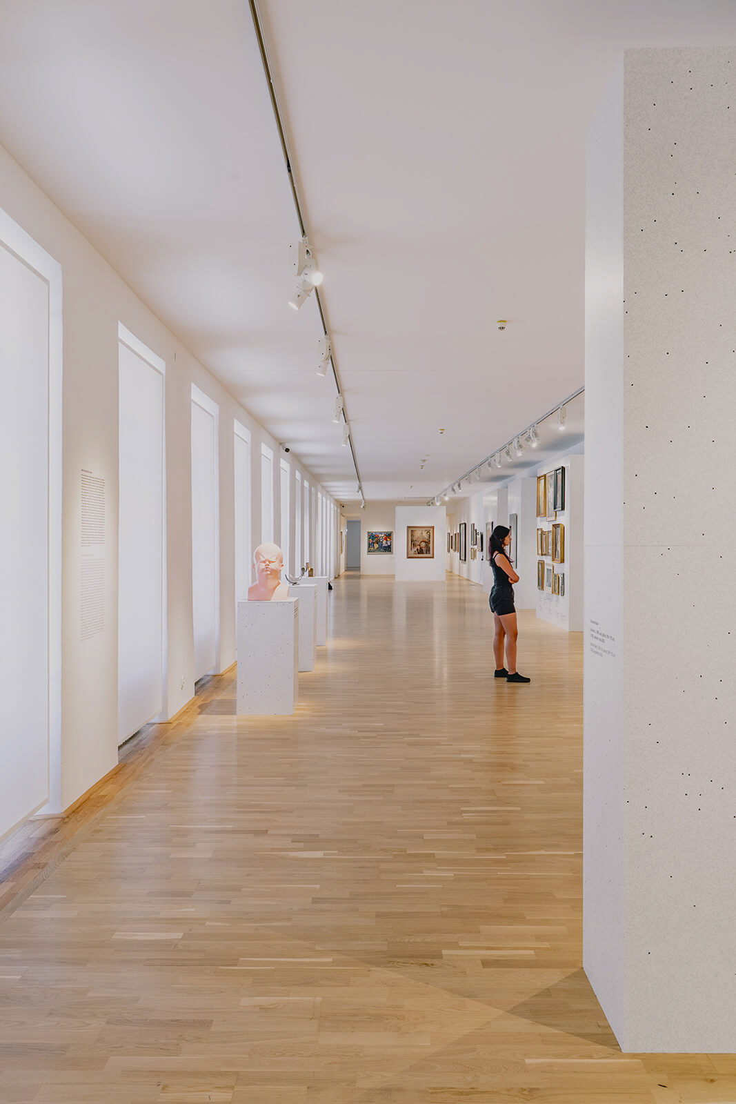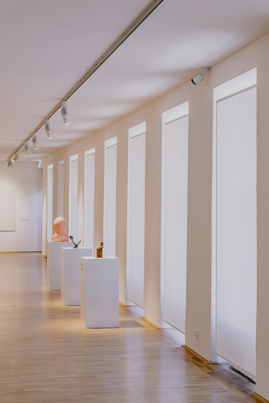 Pracujeme s přirozeným světlem a průhledy do atria v místě odpočinku návštěvníků, přiznaná okna v expozici stíníme průsvitnou deskou s UV filtrem. V expozici je tak čitelný rytmus oken, avšak zachován prostor pro výstavu děl.