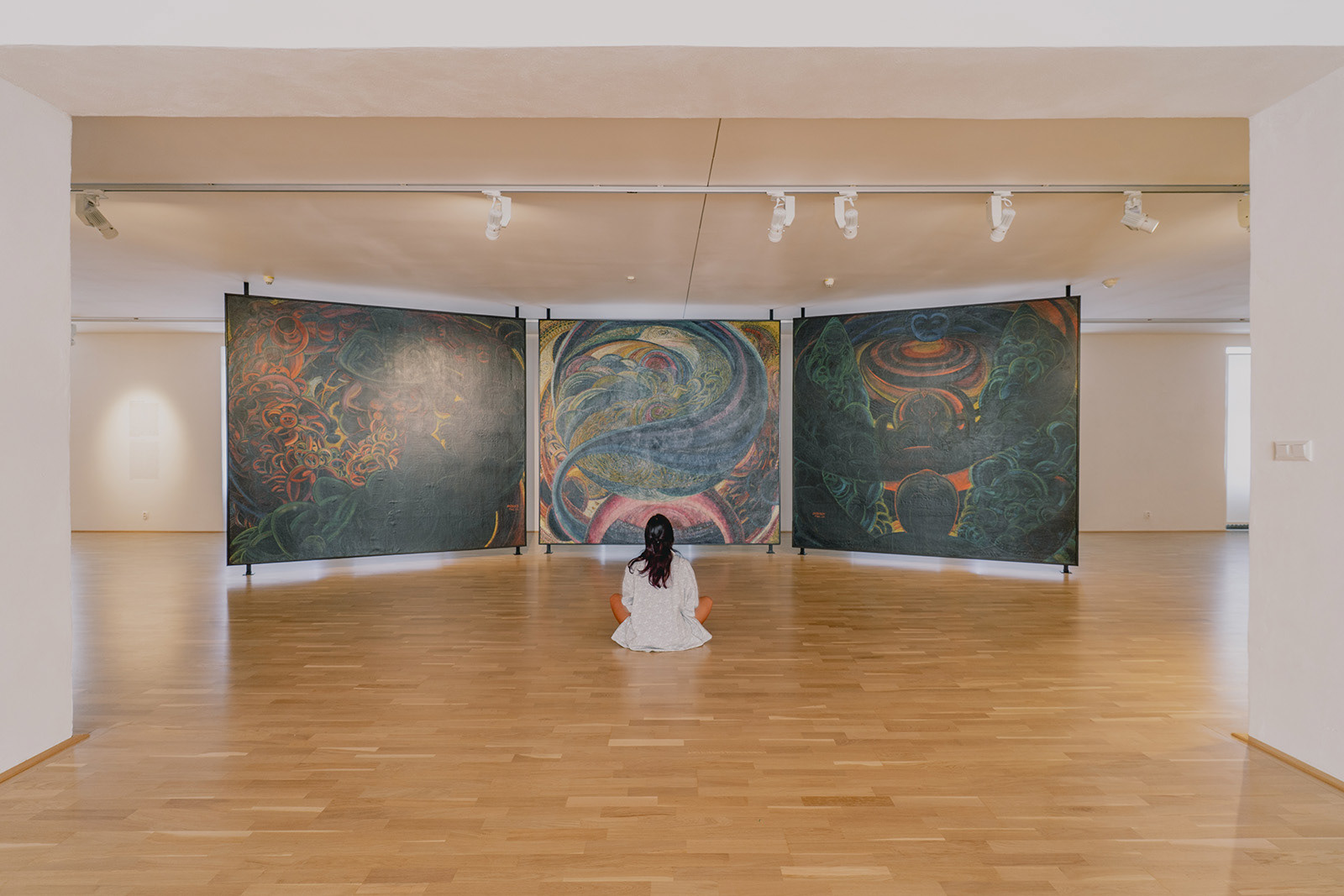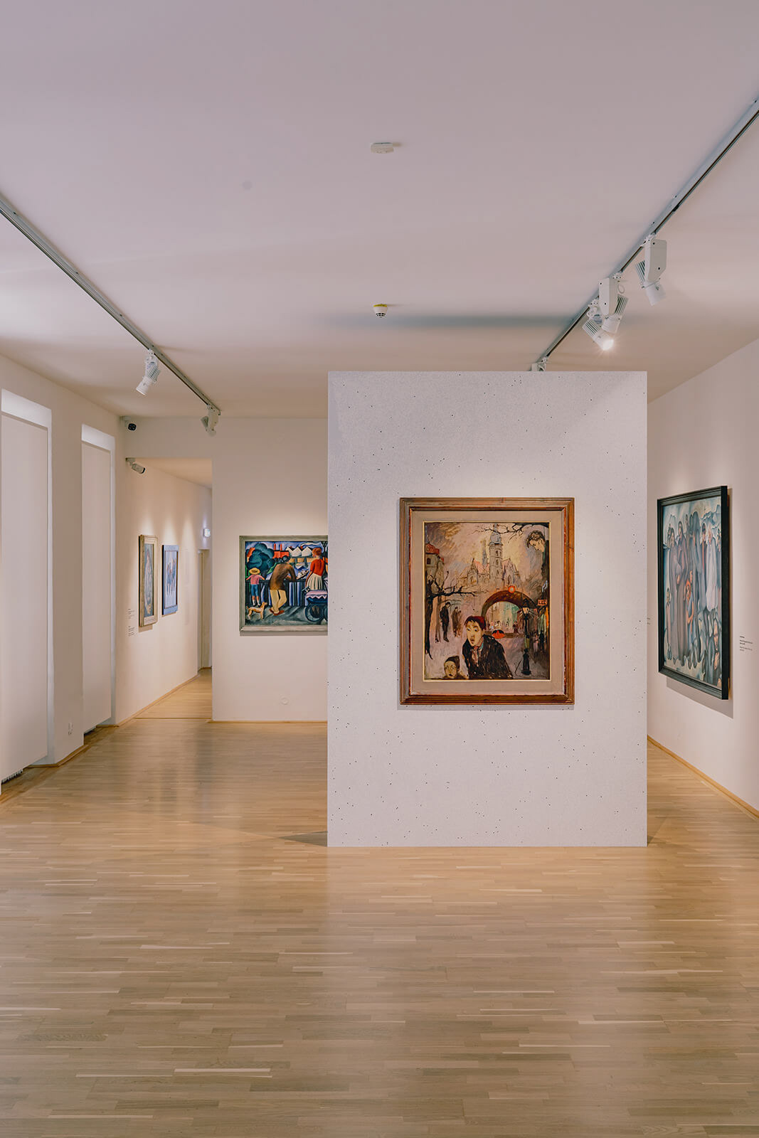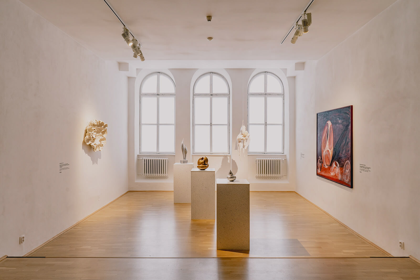 Pracujeme s přirozeným světlem a průhledy do atria v místě odpočinku návštěvníků, přiznaná okna v expozici stíníme průsvitnou deskou s UV filtrem. V expozici je tak čitelný rytmus oken, avšak zachován prostor pro výstavu děl.